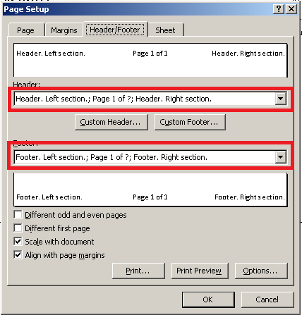 As noted in the Excel Device Information Settings, whether the native page header and footer in Excel are used is controlled through the DefaultPageHeader and DefaultPageFooter device settings.