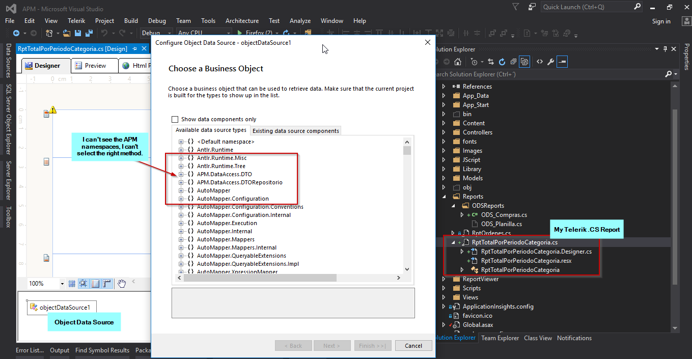 I have created .NET Solution which one use the three layers architecture (DAL: APM.DataAccess, BR: APM.BusinessRules, UI: APM (MVC Web Project)), also I have created a reporting based on class .cs (into APM web layer), I mean compiled report (not standalone). I have created the methods to retrieve data through different layers into my .NET solution. At the end I want to include an ObjectDataSource (because the data retrieved from different Layer needs be processing in order to complete and show in report) into my compiled report but I can't see the main namespace APM (web layer) which contains my method to retrieve data processed in order to display on the report. So when I add the ObjectDataSource into report layout, I can see the popup window where I can choose the Namespace and select the method to retrieve data, but here I can't see APM namespaces and I can't choose the right method. Do you have any idea or comments about it? I attached some images.