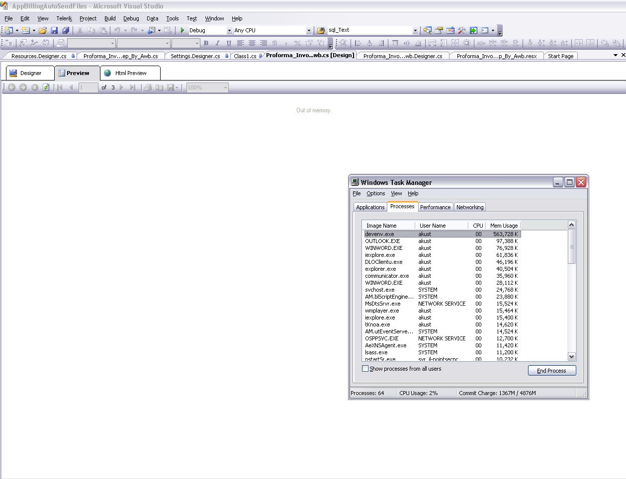 I build a proforma report with telerik and when i run the report in visual studio, the memory goes up to the max pc memory and i get the message "out of memory".