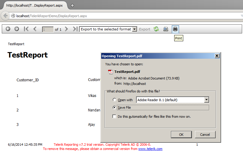 I am using Telerik Reporting Q3 2011 SP1 in my project. I am facing an issue with the Telerik Report Print option on IE 11 and Firefox 30.0 browsers. When I click on Print, it tries to open it as a PDF. For Chrome, it works fine.