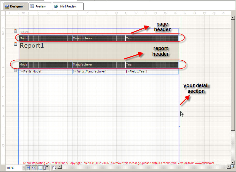 I can't create the report in design time using report wizard because I want the data to come from stored procedure, so I am filling the dataset and trying to create it programmatically. I refer this http://www.telerik.com/help/reporting/?DesigningReportsUnderstandingReportSections.html and create the report like this only without creating the class library. The problem is I want a heading for each column of data.For example: If you look at this link you can see two columns are created one for CustomerId and other Name, so I need to create headings for CustomerId And Name.How can it be possible? I hope now my problem is clear for me.