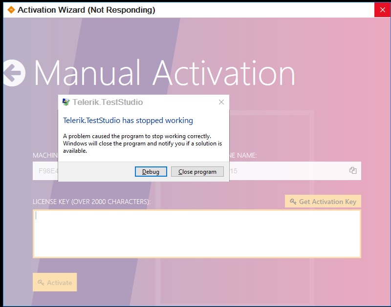 Next thing that came across is what the reason for manual activation is? Usually when the Test Studio machine is online a crash report is automatically sent to our system in case of such. Is it possible to get the machine online and then try installation again?