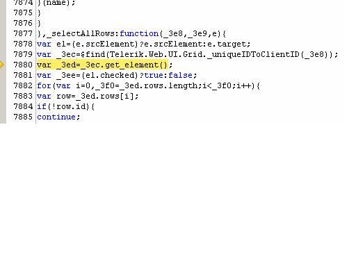 I am using telerik[Version=2008.2.1001.35] radGrid with selectcolumn checkbox functionality. But when I checked header checkbox for selecting all rows it throws js error . The screenshot of the js error is attached in the file "jserror.jpg".Previously I was using telerik [version 2009.2.826.20] & it was working fine.I debug the code and it got stuck to a line the screenshot of which i have attached in the file "debug.jpg". Kindly refer these two files in the attachment.