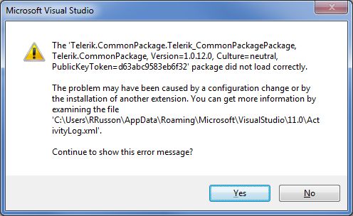 I'm consistently getting extension loading errors at VS start-up (Using latest versions/patches for VS2012, Telerik ASP.NET MVC, Kendo UI DataViz, and Kendo UI for ASP.NET MVC, and Telerik Reporting).