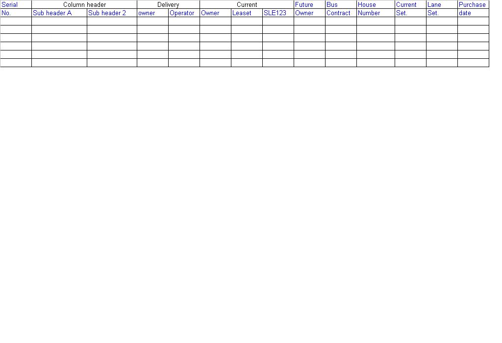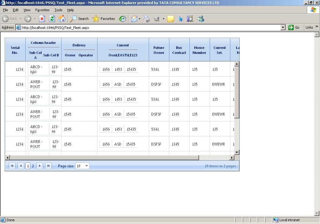 <!--User control .ascx file--> <%@ Control Language="C#" AutoEventWireup="true" CodeFile="uclFleet.ascx.cs" Inherits="UserControls_uclFleet" %> <%@ Register Assembly="Telerik.Web.UI" Namespace="Telerik.Web.UI" TagPrefix="telerik" %> <telerik:RadScriptManager runat="server" ID="RadScriptManager1" /> <script type="text/javascript"> function fnGridCreated(sender, args) { var scrollArea = sender.GridDataDiv; var dataHeight = sender.get_masterTableView().get_element().clientHeight; if (dataHeight < 350) { scrollArea.style.height = dataHeight + 10 + "px"; } } </script> <telerik:RadGrid ID="tlrkDgrFleet" runat="server" EnableViewState="true" CellPadding="0" CellSpacing="0" GridLines="Both" Width="750px" Skin="Office2007" HeaderStyle-Font-Size="8pt" HeaderStyle-Font-Bold="true" AllowPaging="true" ShowHeader="true" OnNeedDataSource="tlrkDgrFleet_NeedDataSource" OnItemDataBound="tlrkDgrFleet_OnItemDataBound"> <MasterTableView CellPadding="0" CellSpacing="0" Width="99%" TableLayout="Fixed" ShowHeader="true" AutoGenerateColumns="false" AllowPaging="true" ShowFooter="false"> <Columns> <telerik:GridTemplateColumn HeaderStyle-HorizontalAlign="Center" HeaderStyle-Width="50px" UniqueName="SerialNo" ItemStyle-HorizontalAlign="Right"> <HeaderTemplate> <table border="0" cellpadding="0" cellspacing="0" width="100%"> <tr> <td style="border: 0" rowspan="2"> Serial <br /> No. </td> </tr> </table> </HeaderTemplate> <ItemTemplate> <asp:Label ID="lblSerialNo" runat="server"><%# Eval("A") %></asp:Label> </ItemTemplate> </telerik:GridTemplateColumn> <telerik:GridTemplateColumn HeaderStyle-HorizontalAlign="Center" HeaderStyle-Width="100px" UniqueName="ColHeader" ItemStyle-HorizontalAlign="left"> <HeaderTemplate> <table border="0" cellpadding="0" cellspacing="0" width="100%"> <tr> <td style="width:100%" colspan="2"> Column header <br /><hr /> </td> </tr> <tr> <td> Sub Col A </td> <td> Sub Col B </td> </tr> </table> </HeaderTemplate> <ItemTemplate> <table border="0" cellpadding="0" cellspacing="0" > <tr> <td> <asp:Label ID="lblA" runat="server" ><%# Eval("B") %></asp:Label> </td> <td> <asp:Label ID="lblE" runat="server"><%# Eval("C") %></asp:Label> </td> </tr> </table> </ItemTemplate> </telerik:GridTemplateColumn> <telerik:GridTemplateColumn HeaderStyle-HorizontalAlign="Center" HeaderStyle-Width="100px" UniqueName="Delivery" ItemStyle-HorizontalAlign="left"> <HeaderTemplate> <table border="0" cellpadding="0" cellspacing="0" width="100%"> <tr> <td style="border: 1" colspan="2"> Delivery<br /><hr /> </td> </tr> <tr> <td> Owner </td> <td> Operator </td> </tr> </table> </HeaderTemplate> <ItemTemplate> <asp:Label ID="lblOwn" runat="server"><%# Eval("D") %></asp:Label> </ItemTemplate> <ItemTemplate> <asp:Label ID="lblOper" runat="server"><%# Eval("E") %></asp:Label> </ItemTemplate> </telerik:GridTemplateColumn> <telerik:GridTemplateColumn HeaderStyle-HorizontalAlign="Center" HeaderStyle-Width="150px" UniqueName="Current" ItemStyle-HorizontalAlign="left"> <HeaderTemplate> <table border="0" cellpadding="0" cellspacing="0" > <tr> <td style="border:0" colspan="3"> Current<br /><hr /> </td> </tr> <tr> <td> Own </td> <td> LEAST </td> <td> SLE123 </td> </tr> </table> </HeaderTemplate> <ItemTemplate> <table border="0" cellpadding="0" cellspacing="0" > <tr> <td> <asp:Label ID="lblCurrOwn" runat="server"><%# Eval("F") %></asp:Label> </td> <td> <asp:Label ID="lblCurrLE" runat="server"><%# Eval("G")%></asp:Label> </td> <td> <asp:Label ID="lblCurrSLE" runat="server"><%# Eval("H") %></asp:Label> </td> </tr> </table> </ItemTemplate> </telerik:GridTemplateColumn> <telerik:GridTemplateColumn HeaderStyle-HorizontalAlign="Center" HeaderStyle-Width="50px" UniqueName="Future" ItemStyle-HorizontalAlign="left"> <HeaderTemplate> <table border="0" cellpadding="0" cellspacing="0" width="100%"> <tr> <td style="border: 0" rowspan="2"> Future <br /> Owner </td> </tr> </table> </HeaderTemplate> <ItemTemplate> <asp:Label ID="lblr" runat="server"><%# Eval("I") %></asp:Label> </ItemTemplate> </telerik:GridTemplateColumn> <telerik:GridTemplateColumn HeaderStyle-HorizontalAlign="Center" HeaderStyle-Width="50px" UniqueName="Bus" ItemStyle-HorizontalAlign="left"> <HeaderTemplate> <table border="0" cellpadding="0" cellspacing="0" width="100%"> <tr> <td style="border: 0" rowspan="2"> Bus <br /> Contract </td> </tr> </table> </HeaderTemplate> <ItemTemplate> <asp:Label ID="lblBusCon" runat="server"><%# Eval("J") %></asp:Label> </ItemTemplate> </telerik:GridTemplateColumn> <telerik:GridTemplateColumn HeaderStyle-HorizontalAlign="Center" HeaderStyle-Width="50px" UniqueName="Number" ItemStyle-HorizontalAlign="left"> <HeaderTemplate> <table border="0" cellpadding="0" cellspacing="0" width="100%"> <tr> <td style="border: 0" rowspan="2"> House <br /> Number </td> </tr> </table> </HeaderTemplate> <ItemTemplate> <asp:Label ID="lblNo" runat="server"><%# Eval("K") %></asp:Label> </ItemTemplate> </telerik:GridTemplateColumn> <telerik:GridTemplateColumn HeaderStyle-HorizontalAlign="Center" HeaderStyle-Width="50px" UniqueName="CurrentSet" ItemStyle-HorizontalAlign="left"> <HeaderTemplate> <table border="0" cellpadding="0" cellspacing="0" width="100%"> <tr> <td style="border: 0" rowspan="2"> Current <br /> Set. </td> </tr> </table> </HeaderTemplate> <ItemTemplate> <asp:Label ID="lblCurrentSet" runat="server"><%# Eval("L") %></asp:Label> </ItemTemplate> </telerik:GridTemplateColumn> <telerik:GridTemplateColumn HeaderStyle-HorizontalAlign="Center" HeaderStyle-Width="50px" UniqueName="LaneNo" ItemStyle-HorizontalAlign="left"> <HeaderTemplate> <table border="0" cellpadding="0" cellspacing="0" width="100%"> <tr> <td style="border: 0" rowspan="2"> Lane <br /> No. </td> </tr> </table> </HeaderTemplate> <ItemTemplate> <asp:Label ID="lblLaneNo" runat="server"><%# Eval("M") %></asp:Label> </ItemTemplate> </telerik:GridTemplateColumn> <telerik:GridTemplateColumn HeaderStyle-HorizontalAlign="Center" HeaderStyle-Width="50px" UniqueName="PurDate" ItemStyle-HorizontalAlign="center"> <HeaderTem