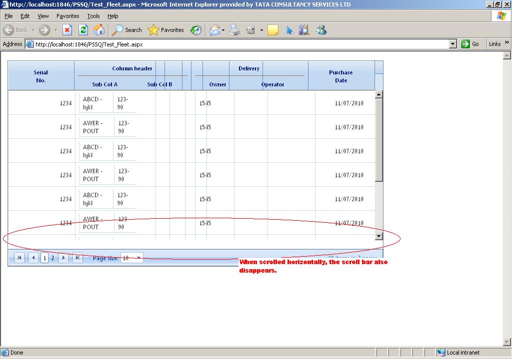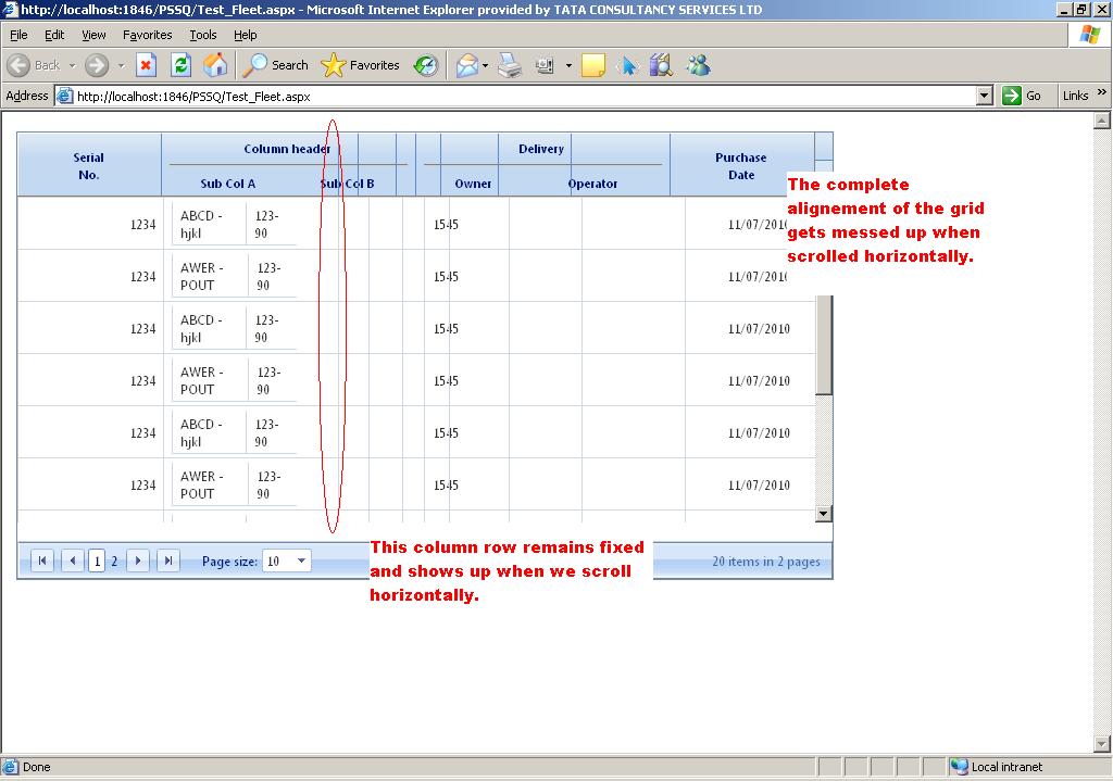 a) When we scroll, the complete alignment of the grid gets messed up, and one Grid line remains there and shows up in the middle of all scrolling columns. Refer "Screenshot2.JPG" .