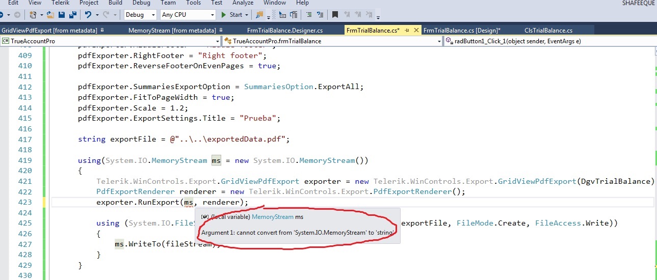 Telerik.WinControls.Export.GridViewPdfExport pdfExporter = new Telerik.WinControls.Export.GridViewPdfExport(DgvTrialBalance); pdfExporter.FileExtension = ".pdf"; pdfExporter.ShowHeaderAndFooter = true; pdfExporter.HeaderHeight = 30; pdfExporter.HeaderFont = new Font("Arial", 22); //pdfExporter.Logo = System.Drawing.Image.FromFile(@"C:\temp\logo.png"); //pdfExporter.LeftHeader = "[Logo]"; //pdfExporter.LogoAlignment = ContentAlignment.MiddleLeft; //pdfExporter.LogoLayout = Telerik.WinControls.Export.LogoLayout.Fit; pdfExporter.MiddleHeader = "Middle header"; pdfExporter.RightHeader = "Right header"; pdfExporter.ReverseHeaderOnEvenPages = true; pdfExporter.FooterHeight = 30; pdfExporter.FooterFont = new Font("Arial", 22); pdfExporter.LeftFooter = "Left footer"; pdfExporter.MiddleFooter = "Middle footer"; pdfExporter.RightFooter = "Right footer"; pdfExporter.ReverseFooterOnEvenPages = true; pdfExporter.SummariesExportOption = SummariesOption.ExportAll; pdfExporter.FitToPageWidth = true; pdfExporter.Scale = 1.2; pdfExporter.ExportSettings.Title = "Prueba"; string exportFile = @"..\..\exportedData.pdf"; using(System.IO.MemoryStream ms = new System.IO.MemoryStream()) { Telerik.WinControls.Export.GridViewPdfExport exporter = new Telerik.WinControls.Export.GridViewPdfExport(DgvTrialBalance); PdfExportRenderer renderer = new Telerik.WinControls.Export.PdfExportRenderer(); exporter.RunExport(ms , renderer); using (System.IO.FileStream fileStream = new System.IO.FileStream(exportFile, FileMode.Create, FileAccess.Write)) { ms.WriteTo(fileStream); } }[quote]Dimitar said:Hi Gustavo,