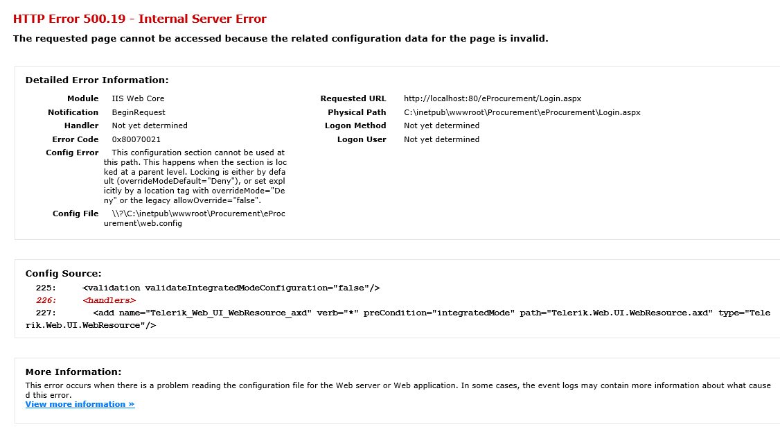 I installed Telerik version "2010.3.1109.40" on windows 10 machine and launched an asp.net web-site , i am getting an error "The page cannot be accessed because the related configuration data for the page is invalid and points to "Telerik_Web_UI_WebResource_axd" in web.config file. See attached file