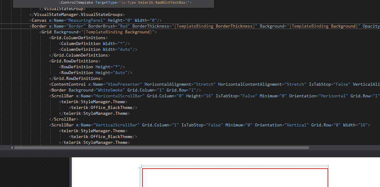 i grabbed the telerik editor and used in my WPF application, now i need to blink in red when the user exceeds the character length, but i'm unable to accomplish that, i can't even change the borderbrush of the RadRichTextBox that is within the Telerik Editor.