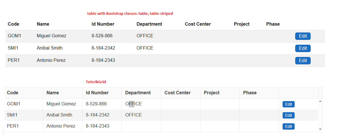 2. The TelerikGrid with the same headers and data. Notice how the columns are all the same width.