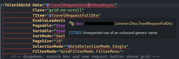 On all my <TelerikGrid> tags I am getting the error: Unexpected use of an unbound generic name on most of the values I pass into this grid except for FilterMode. The error does not prevent a build but I can't figure out how to get it to go away. The same thing is showing on all my grids and has always been there. Restarting visual studio does not fix it. See the code snippet below for the grid and my attachment shows a screenshot of the grid declaration code with the error lines. The [***] is just a stand in to anonymize the code. Can anyone explain what is causing the error?