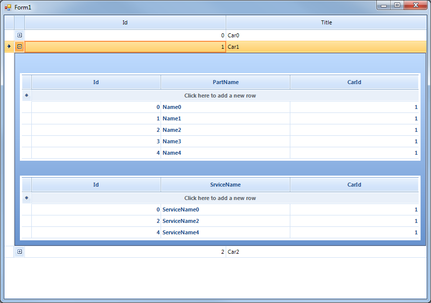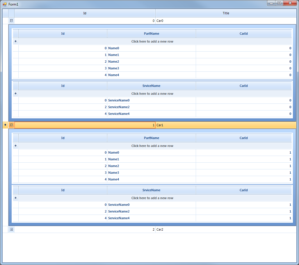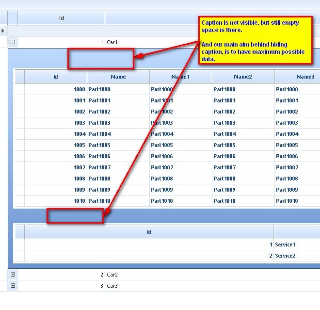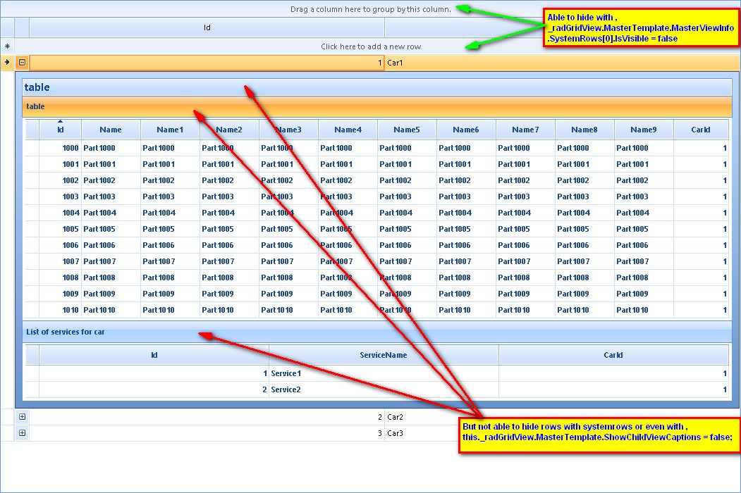 public Form1(){ InitializeComponent(); List<Car> cars = new List<Car>(); List<Part> parts = new List<Part>(); List<Service> services = new List<Service>(); for (int i = 0; i < 3; i++) { cars.Add(new Car(i,"Car" + i)); for (int j = 0; j < 5; j++) { parts.Add(new Part(j,"Name" + j,i)); if (j % 2 == 0) { services.Add(new Service(j,"ServiceName" + j,i)); } } } radGridView1.DataSource = cars; radGridView1.AutoSizeColumnsMode = GridViewAutoSizeColumnsMode.Fill; GridViewTemplate firstChildtemplate = new GridViewTemplate(); firstChildtemplate.DataSource = parts; radGridView1.MasterTemplate.Templates.Add(firstChildtemplate); firstChildtemplate.AutoSizeColumnsMode = GridViewAutoSizeColumnsMode.Fill; GridViewRelation relation = new GridViewRelation(radGridView1.MasterTemplate); relation.ChildTemplate = firstChildtemplate; relation.RelationName = "CarsParts"; relation.ParentColumnNames.Add("Id"); relation.ChildColumnNames.Add("CarId"); radGridView1.Relations.Add(relation); GridViewTemplate secondChildtemplate = new GridViewTemplate(); secondChildtemplate.DataSource = services; radGridView1.MasterTemplate.Templates.Add(secondChildtemplate); secondChildtemplate.AutoSizeColumnsMode = GridViewAutoSizeColumnsMode.Fill; GridViewRelation relation2 = new GridViewRelation(radGridView1.MasterTemplate); relation2.ChildTemplate = secondChildtemplate; relation2.RelationName = "CarsServices"; relation2.ParentColumnNames.Add("Id"); relation2.ChildColumnNames.Add("CarId"); radGridView1.Relations.Add(relation2); this.radGridView1.TableElement.PageViewMode = PageViewMode.ExplorerBar;}private void radGridView1_ViewCellFormatting(object sender, CellFormattingEventArgs e){ GridDetailViewCellElement detailCell = e.CellElement as GridDetailViewCellElement; if (detailCell != null) { detailCell.PageViewElement.Header.Visibility = Telerik.WinControls.ElementVisibility.Collapsed; RadPageViewExplorerBarElement el = detailCell.PageViewElement as RadPageViewExplorerBarElement; if (el != null) { foreach (RadPageViewExplorerBarItem item in el.Items) { item.Visibility = Telerik.WinControls.ElementVisibility.Hidden; } } }}public class Car{ public int Id { get; set; } public string Title { get; set; } public Car(int id, string title) { this.Id = id; this.Title = title; }}public class Part{ public int Id { get; set; } public string PartName { get; set; } public int CarId { get; set; } public Part(int id, string name, int carId) { this.Id = id; this.PartName = name; this.CarId = carId; }}public class Service{ public int Id { get; set; } public string SrviceName { get; set; } public int CarId { get; set; } public Service(int id, string srviceName, int carId) { this.Id = id; this.SrviceName = srviceName; this.CarId = carId; }}As to the question, related to hiding group area and add new row functionality you can use the following code:
