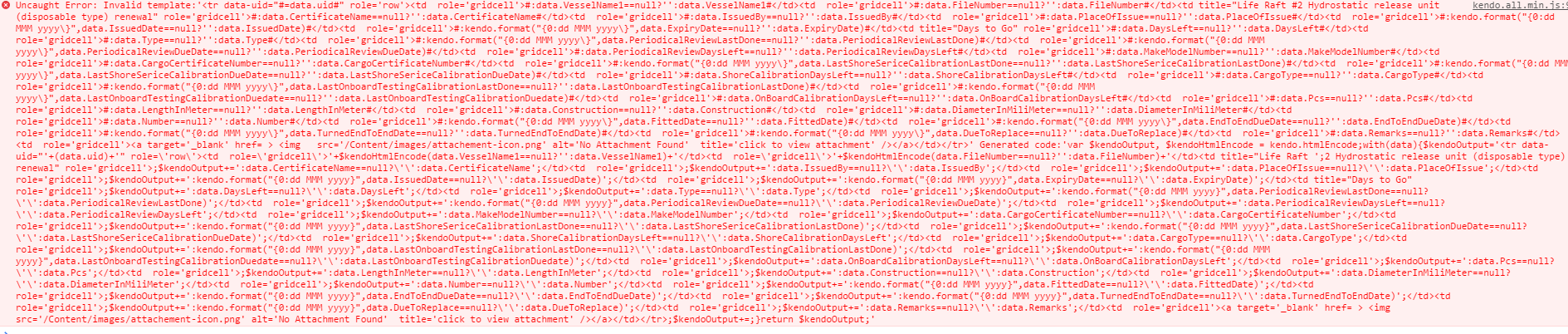 Invalid template... Generated code: var $kendoOutput, $kendoHtmlEncode = kendo.htmlEncode;with(data){$kendoOutput='<div class="k-widget k-grid" id="myGrid"><table><colgroup><col /></colgroup><thead class="k-grid-header"><tr><th class="k-header" data-field="Name" data-index="0" data-title="Name" scope="col"><span class="k-link">Name</span></th></tr></thead><tbody><tr class="k-no-data"><td colspan="1"></td></tr></tbody></table></div><script>\n\tjQuery(function(){jQuery("';myGrid").kendoGrid({"columns":[{"title":"Name","field":"Name","encoded":true}],"scrollable":false,"autoBind":false,"dataSource":{"type":(function(){if(kendo.data.transports['aspnetmvc-server']){return 'aspnetmvc-server';} else{throw new Error('The kendo.aspnetmvc.min.js script is not included.');}})(),"transport":{"read":{"url":""},"prefix":"channelsAssignGrid-"},"serverPaging":true,"serverSorting":true,"serverFiltering":true,"serverGrouping":true,"serverAggregates":true,"filter":[],"schema":{"data":"Data","total":"Total","errors":"Errors","model":{"fields":{"Name":{"type":"string"}}}}}});}); ;$kendoOutput+=;}return $kendoOutput;