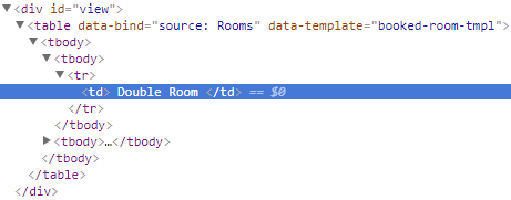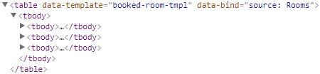 <script type="text/x-kendo-template" id="booked-room-tmpl"> <tbody><tr> <td> #= RoomName# </td></tr></tbody> </script>