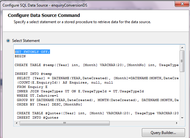 In order to use stored procedures containing temporary tables, you have to turn off FMTONLY in a seemingly never executed statement. Thus the data schema of temporary tables can be read by the SqlDataSource Wizard as each state of IF-ELSE statements is evaluated when the SQL query is run by the SqlDataSource Wizard. The check will be skipped when the same SQL query is used by calling application at run-time.
