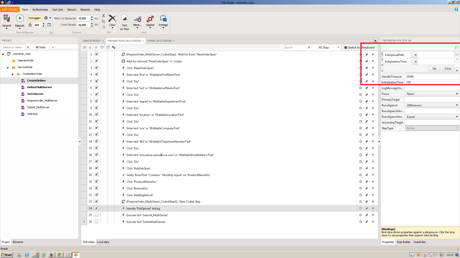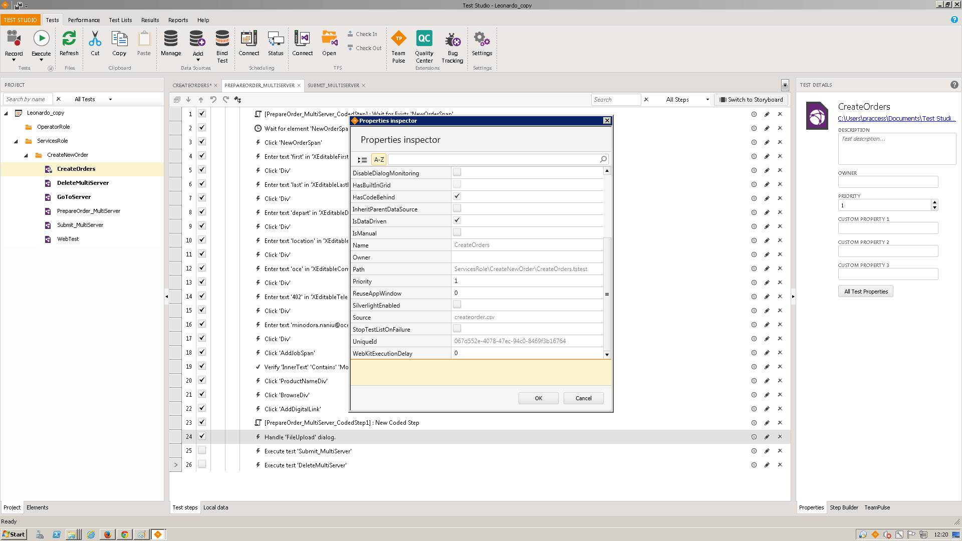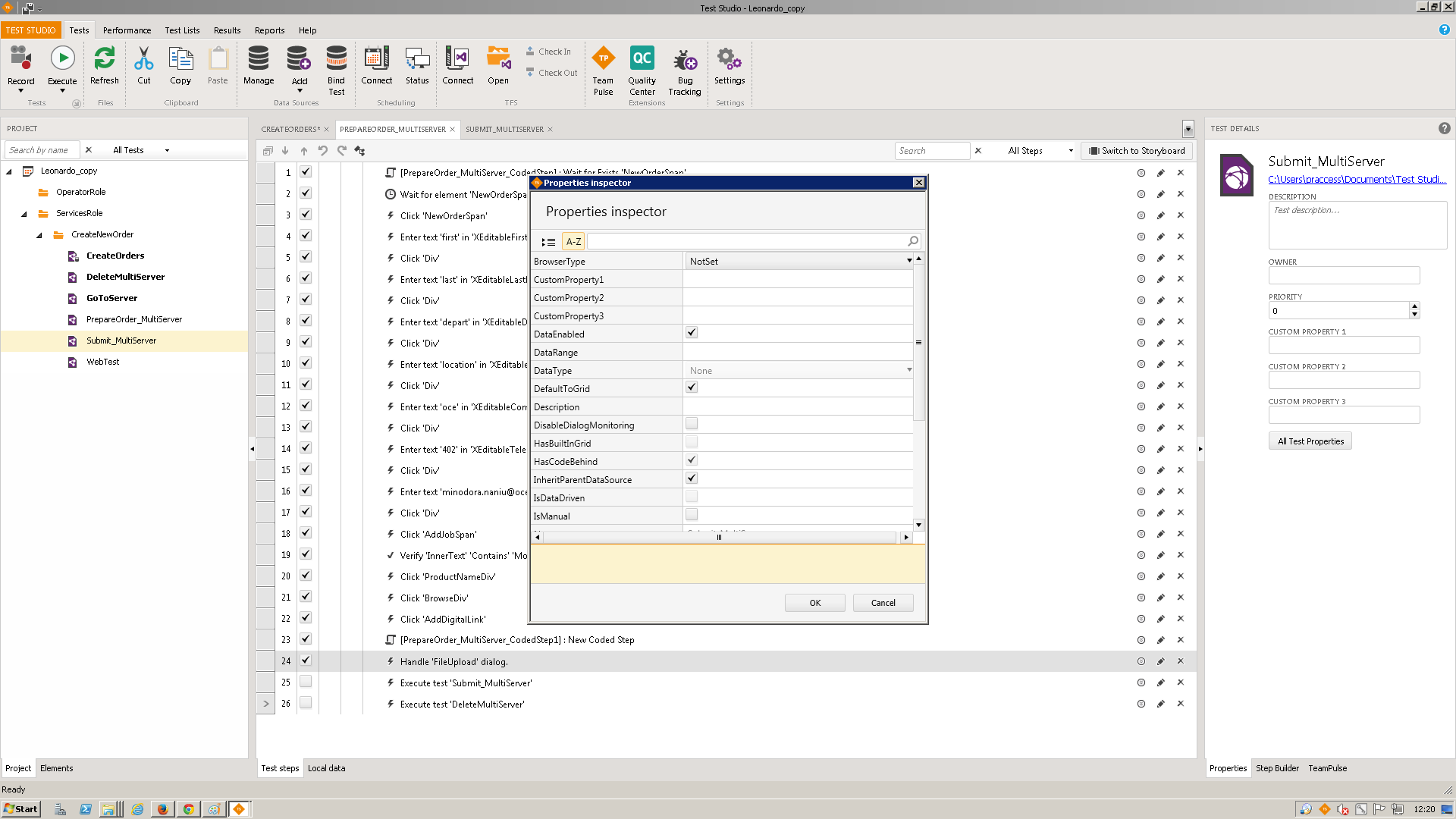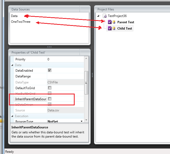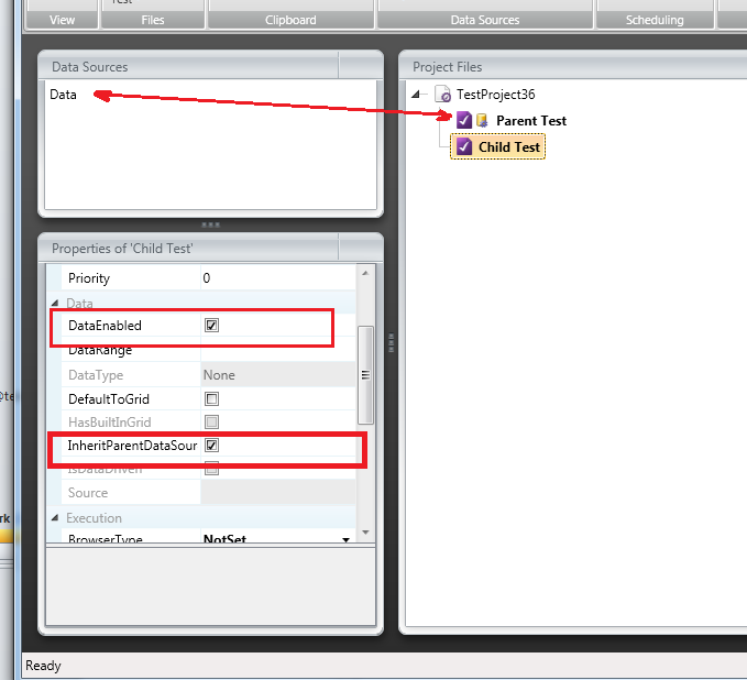 In the project tab, I have the main test (Refresh_Wrapper) with DataEnabled checked. The child test (Refresh_Parameters) has DataEnabled unchecked and InheritParentDataSource checked.