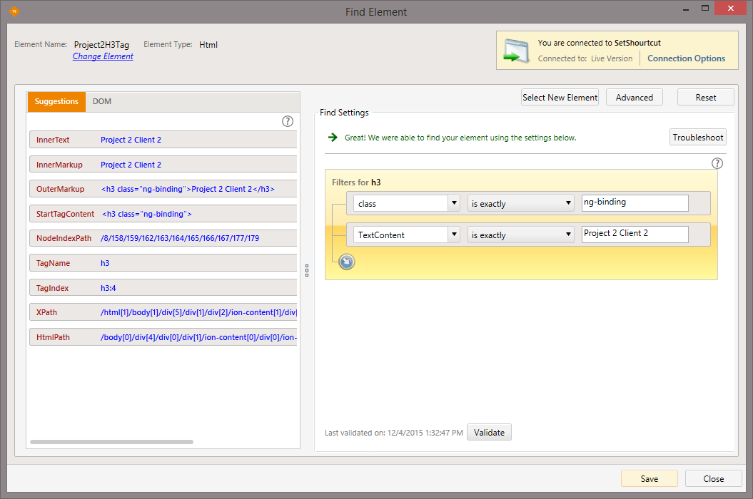 I have a web application built with http://ionicframework.com/. On the test execution there is a problem with element selection on pop-up message (see video in att.). Element is successfully validated if in Live mode and also Simulate real click is enabled on the test step.
