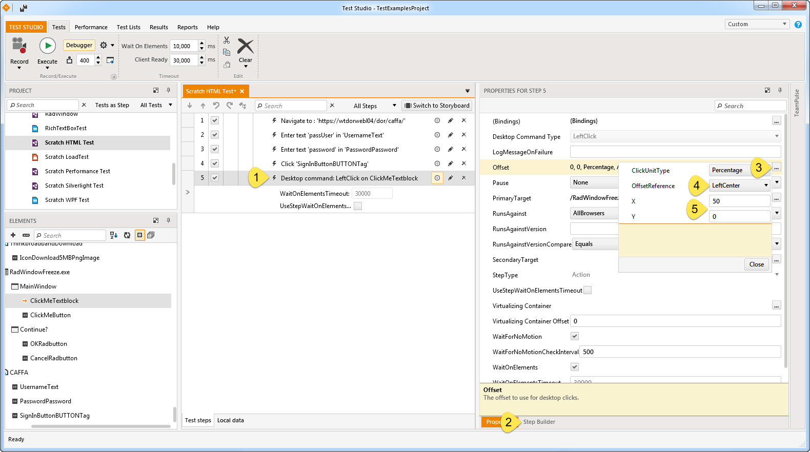 I'm glad I could help. I actually recommend setting the X value to a small positive number. By setting it to zero your instructing Test Studio to click on the exact edge of the element which may not work in all cases, all browsers. By setting it to a small positive number it will make Test Studio click just slightly to the right of the edge of the element which will be more reliable in all cases, all browsers.