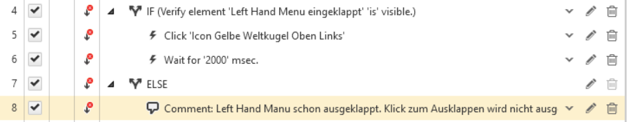 However, in the same context I still have trouble with an if-statement: The screenshot "if-else.png" is part of a test that is executed as "Execute test"-command. The commands in the if-else-statement and the "Execute test"-command are marked as "Continue on Failure". I want to click an element ("Icon Gelbe Weltkugel oben links") only if another element ("Left Hand Menu eingeklappt") is visible.