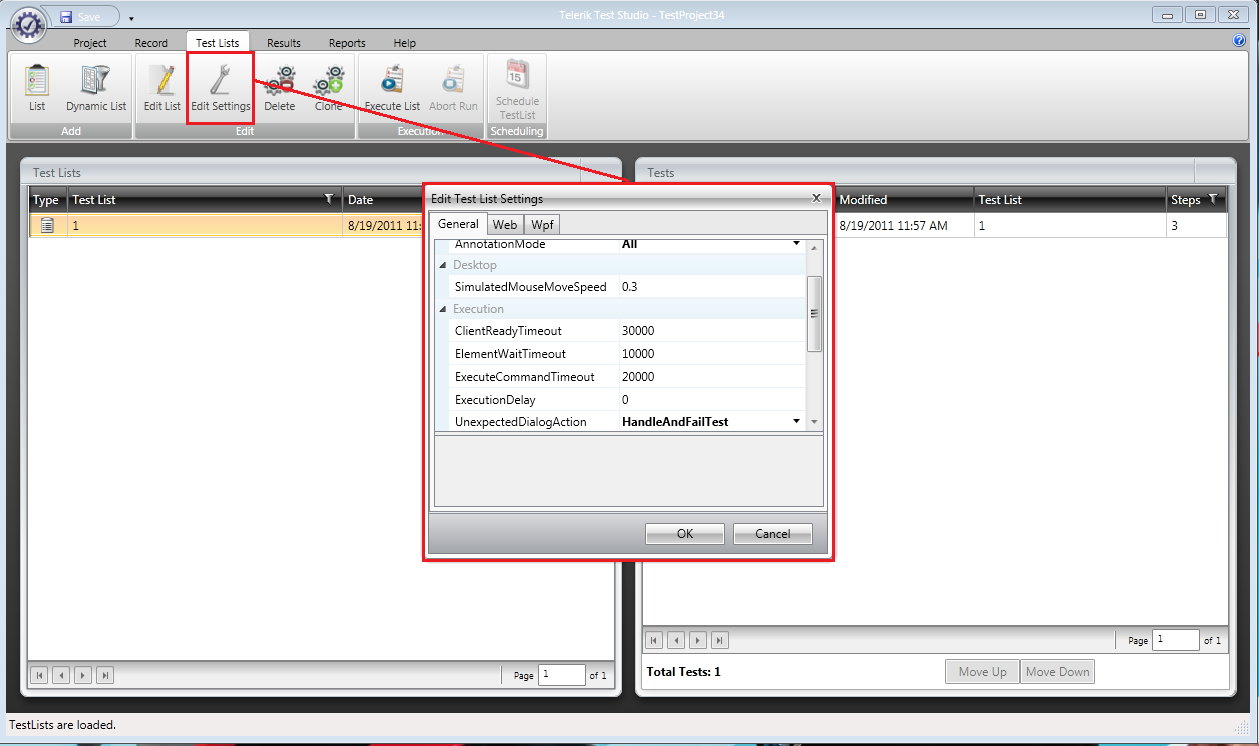 Test Studio is rigged to always fails tests when they take too long. It's a very unusual problem for TestList to be hung. At what point in your TestList execution does it get hung. My guess is that this isn't related to an HTML elements that's missing or something along those lines. The only situation that I can think of is a connection issue if you've got the Silverlight Connect timeout bumped up to an unreasonably high number (screenshot 1).