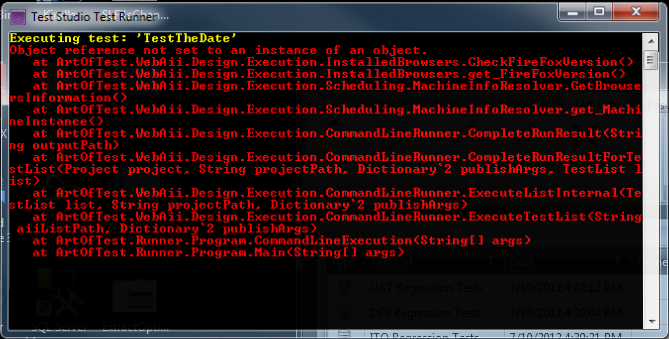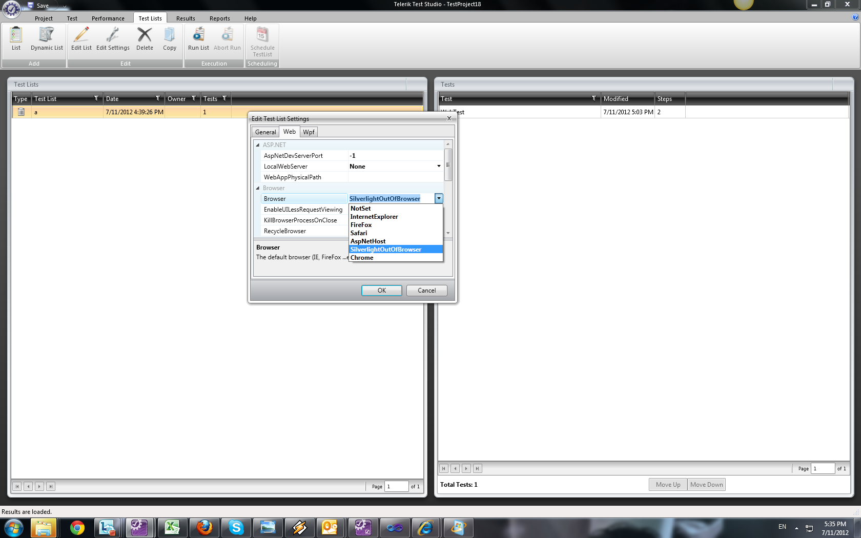 I have two automated tests that run against a SL Out of Browser application. Both these tests are running correctly. The problem occurs when I add both tests to a test list. In (Test List) Edit Settings (for the Browser Option), I select Silverlight Out of Browser. When I select Run List, it looks like Test Studio is about to run my tests. But, the OOB Silverlight application never opens. Then, Test Studio is on the Results tab with the timeline on the screen. How do I get my automated scripts to run in the Test List?