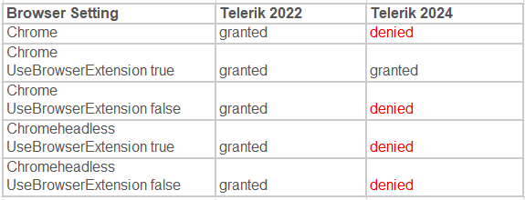 We met one issue, for click copy button and get clip text, with telerik 2024, chrome could work well, but chrome headless couldn't work well, the text is always empty.