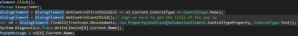 And we used dialogElement(the namespace is ArtOfTest.Common.Extensions) to catch the message. It works but after that we can't control the page. Whatever we tried like refresh the page or press enter by code, it always stuck until alert is closed manually or time out. Is there some one has the same situation? And if so, how to solve it?