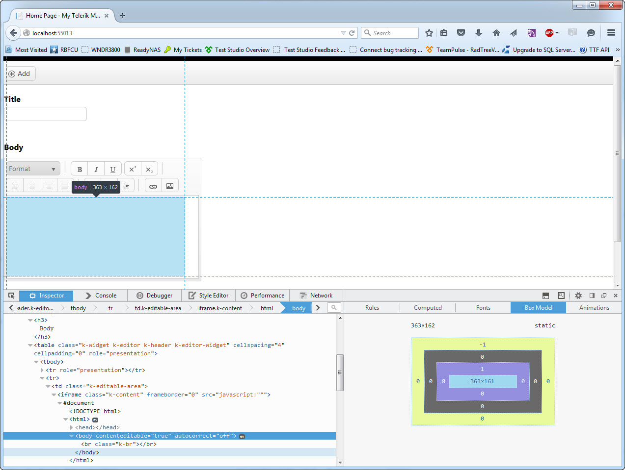 I'm trying to record a test involving adding an item to a Kendo List View that has a Kendo Editor defined in its edit template. I am unable to get the "click" or "typing" into the editor to be recorded as part of the test. All other aspects of the test scenario (typing into other kendo controls on the edit form, clicking submit, etc) are recorded and execute as expected.