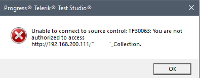 Image 2: when selecting the TFS project, Telerik Test Studio, I receive the TF30063 error, stating that I am an unauthorized user.