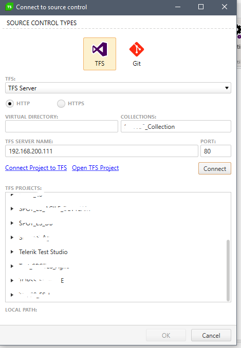 Image 1. With Telerik Test studio open to the Project I am using, connect to TFS using the values below.