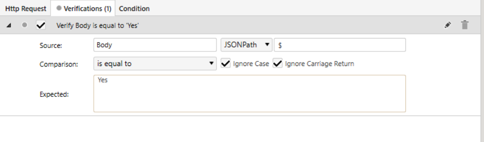 I do not know what to put in the JSONPath to find that Yes or No value from my API Call. Overall I'm not sure this is the best way to get the information I want. Should I be using a Verification API test instead of HTTP?