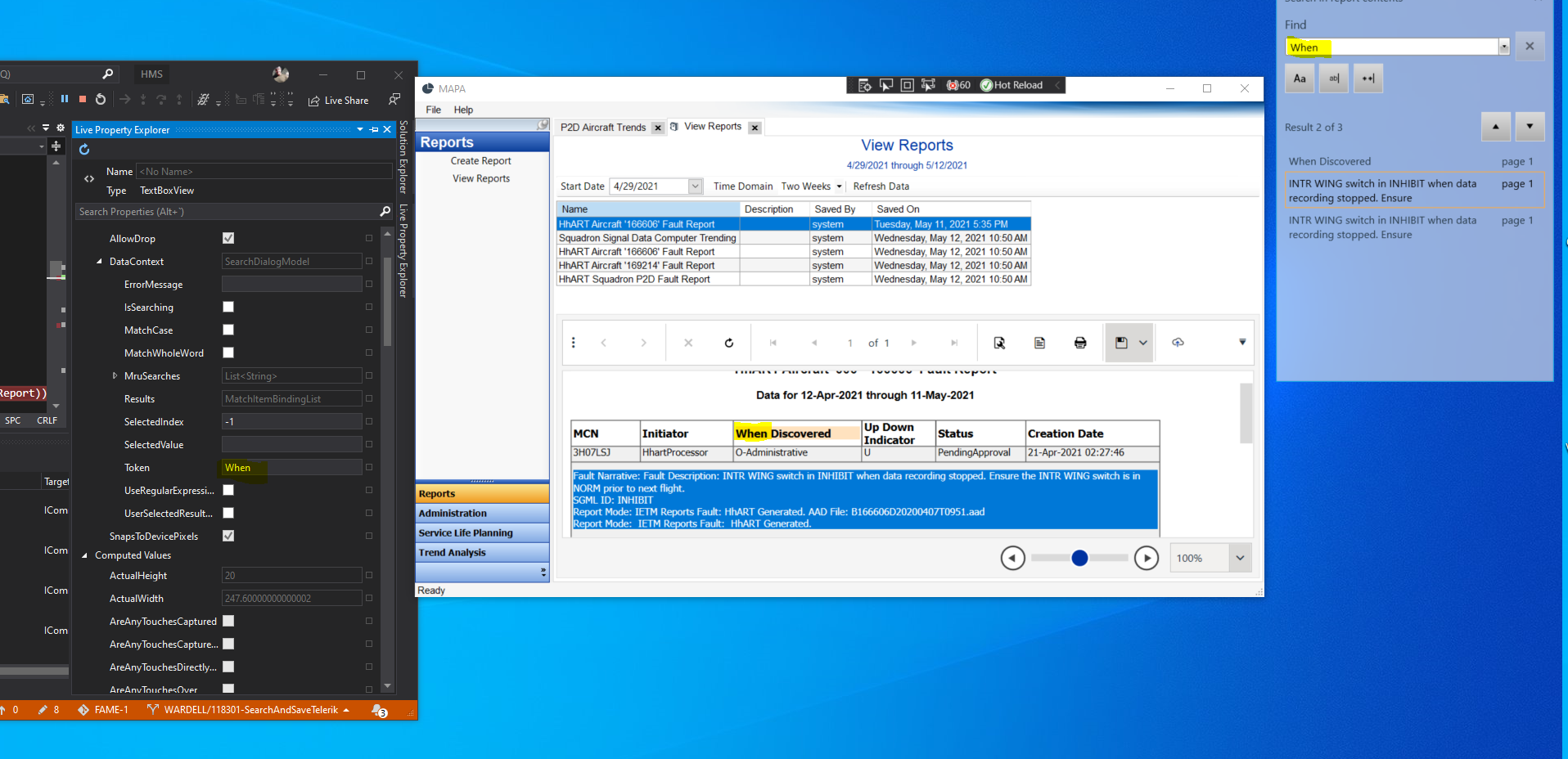 I have proven binding by using Visual Property Live Inspector to modify Token Value at runtime. When I modify Token in Visual Studio Live Property Editor it searches report and then highlights as requested. If you can tell me what i must do to enable the Find Text Box the Software will be now be deliverable. Follow the Yellow Higlighted areas in attached pic with word "When" in the Live Visual Property Editor