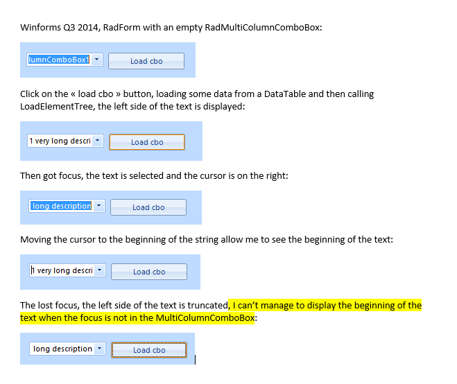 public Form1(){ InitializeComponent(); List<Item> items = new List<Item> { new Item(1, "Soooome veeeeeery looong text") }; this.radDropDownList1.DataSource = items; this.radDropDownList1.DisplayMember = "Name"; this.radDropDownList1.ValueMember = "Id"; this.radMultiColumnComboBox1.DataSource = items; this.radMultiColumnComboBox1.DisplayMember = "Name"; this.radMultiColumnComboBox1.ValueMember = "Id";}public class Item{ public int Id { get; set; } public string Name { get; set; } public Item(int id, string name) { this.Id = id; this.Name = name; }}protected override void OnLoad(EventArgs e){ this.radDropDownList1.SelectionLength = 0; this.radMultiColumnComboBox1.MultiColumnComboBoxElement.SelectionStart = 0; base.OnLoad(e);}If it is not suitable for your specific case, please specify which version you use. Thank you in advance.