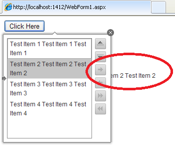 <%@ Page Language="C#" AutoEventWireup="true" CodeBehind="WebForm1.aspx.cs" Inherits="ToolTipDragIssue.WebForm1" %> <%@ Register Assembly="Telerik.Web.UI" Namespace="Telerik.Web.UI" TagPrefix="telerik" %> <!DOCTYPE html PUBLIC "-//W3C//DTD XHTML 1.0 Transitional//EN" "http://www.w3.org/TR/xhtml1/DTD/xhtml1-transitional.dtd"> <html xmlns="http://www.w3.org/1999/xhtml"> <head runat="server"> <title></title> </head> <body> <form id="form1" runat="server"> <asp:ScriptManager runat="server" ID="ScriptManager1" /> <asp:Button ID="Button1" runat="server" Text="Click Here" /> <div> <telerik:RadToolTip ID="RadToolTip1" runat="server" ShowEvent="OnClick" TargetControlID="Button1" HideEvent="ManualClose"> <telerik:RadListBox ID="RadListBox1" runat="server" Width="200px" Height="200px" AllowTransfer="true" AllowReorder="true" AutoPostBackOnReorder="true" EnableDragAndDrop="true"> <Items> <telerik:RadListBoxItem Text="Test Item 1 Test Item 1 Test Item 1 " /> <telerik:RadListBoxItem Text="Test Item 2 Test Item 2 Test Item 2 "/> <telerik:RadListBoxItem Text="Test Item 3 Test Item 3 Test Item 3 "/> <telerik:RadListBoxItem Text="Test Item 4 Test Item 4 Test Item 4 " /> </Items> </telerik:RadListBox> </telerik:RadToolTip> </div> </form> </body> </html>Thanks,