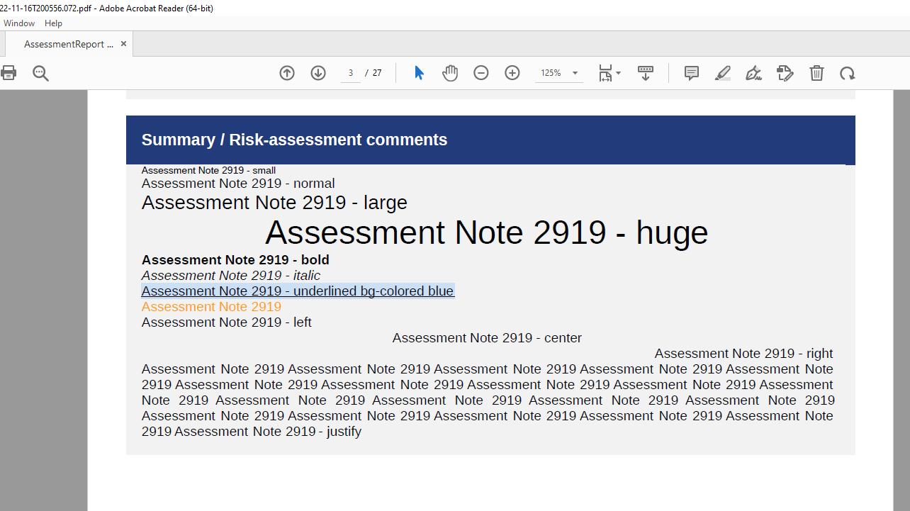 1) In the report I have a table that displays some note. This note is retrieved from the database as a string with html-markup (with all necessary tags and its different attributes). All properties of the attribute "Style" work as expected except "text-align: justify". As a result in HTML-viewer I have the note (s.attached overwritten1.png). The text somehow is overlapped/owerwritten. In PDF it looks good though (s.attached overwritten1_PDF.png). In the Sdandalone Report Designer (Preview mode) it works correctly. Unfortunately I can't reproduce the issue with demo example and CSV datasource, but when the report runs and retrieves justified note from the database the issue occurs each time.