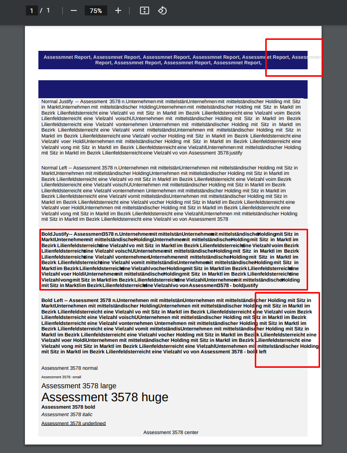 When the text has bold font-weight (using <strong>-tag) it is not justified even in Designer (Preview mode). In PDF it is also absolutely incorrect: with left-alignment text doesn't match the table size at all, with justify-alignment - text is overlapped and overwritten