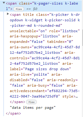 <div class="k-pager-wrap k-grid-pager k-widget k-floatwrap" data-role="pager"> <a href="#" aria-label="Go to the first page" title="Go to the first page" class="k-link k-pager-nav k-pager-first k-state-disabled" data-page="1" tabindex="-1"> <span class="k-icon k-i-arrow-end-left"></span> </a> <a href="#" aria-label="Go to the previous page" title="Go to the previous page" class="k-link k-pager-nav k-state-disabled" data-page="1" tabindex="-1"> <span class="k-icon k-i-arrow-60-left"></span> </a> <div class="k-pager-numbers-wrap"> <ul class="k-pager-numbers k-reset"> <li class="k-current-page"> <span class="k-link k-pager-nav">1</span> </li> <li> <span class="k-state-selected">1</span> </li> </ul> </div> <a href="#" aria-label="Go to the next page" title="Go to the next page" class="k-link k-pager-nav k-state-disabled" data-page="1" tabindex="-1"> <span class="k-icon k-i-arrow-60-right"></span> </a> <a href="#" aria-label="Go to the last page" title="Go to the last page" class="k-link k-pager-nav k-pager-last k-state-disabled" data-page="1" tabindex="-1"> <span class="k-icon k-i-arrow-end-right"></span> </a> <span class="k-pager-sizes k-label"> <span title="" class="k-widget k-dropdown" unselectable="on" role="listbox" aria-haspopup="true" aria-expanded="false" tabindex="0" aria-owns="f799b4c5-6a1f-401c-b428-523ad5a6dd81_listbox" aria-live="polite" aria-disabled="false" aria-busy="false" aria-activedescendant="ab0503cf-cd7e-4806-8420-81d063a6bfe8" style=""> <span unselectable="on" class="k-dropdown-wrap k-state-default"> <span unselectable="on" class="k-input">20</span> <span unselectable="on" class="k-select" aria-label="select"> <span class="k-icon k-i-arrow-60-down"></span> </span> </span> <select data-role="dropdownlist" aria-label="20" style="display: none;"> <option value="10">10</option> <option value="20" selected="selected">20</option> <option value="50">50</option> <option value="100">100</option> </select> </span> </span> <a href="#" class="k-pager-refresh k-link" title="Refresh" aria-label="Refresh"> <span class="k-icon k-i-reload"></span> </a> <span class="k-pager-info k-label">1 - 2 of 2 items</span> </div>I checked the culture as well; it is en-US.