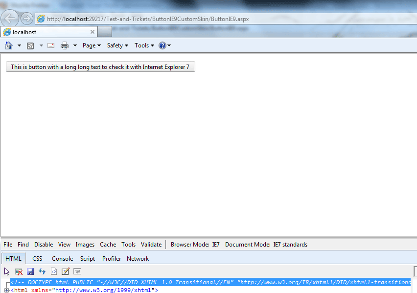 <%@ Register TagPrefix="telerik" Namespace="Telerik.Web.UI" Assembly="Telerik.Web.UI" %><!DOCTYPE html PUBLIC "-//W3C//DTD XHTML 1.0 Transitional//EN" "http://www.w3.org/TR/xhtml1/DTD/xhtml1-transitional.dtd"><html xmlns="http://www.w3.org/1999/xhtml"><head runat="server"> <title></title> <style type="text/css"> </style></head><body> <form id="form1" runat="server"> <asp:ScriptManager ID="ScriptManager1" runat="server"> </asp:ScriptManager> <telerik:RadButton ID="rb1" runat="server" Text="This is button with a long long text to check it with Internet Explorer 7"></telerik:RadButton> </form></body></html>Everything works as expected in all browsers. Attached is ie7button.gif showing the result in IE7.
