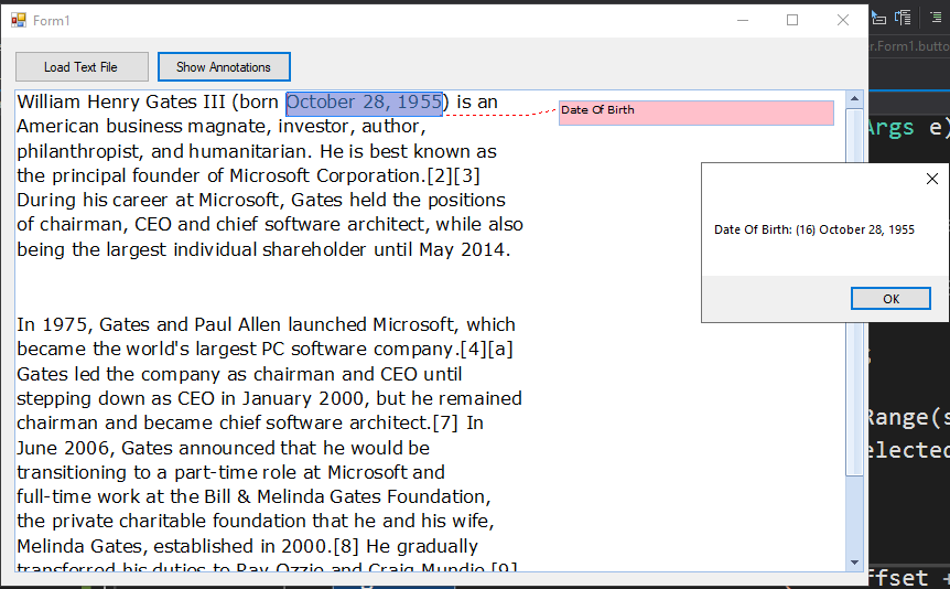 1.foreach (var start in rtf.Document.GetAnnotationMarkersOfType<CommentRangeStart>())2.{3. CommentRangeEnd end = (CommentRangeEnd)start.End;4. Comment comment = end.Comment;5. Span textSpan = (Span)start.NextSibling;6. int positionOfText = ??7. msgBoxString += comment.Author + ": " + textSpan.Text + "\r\n";8.}