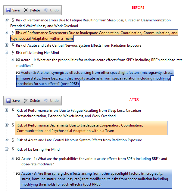 The second screenshot is from a different page where the user can edit the content using drag and drop. The top section shows the current alignment along with a hover and a selected item. The bottom section shows what I'd like to have. I prefer that alignment and I also like how the hover and selected items look. I got this far using the CSS below. But there are still issues with vertical spacing on expanded nodes, and the position: relative and top: -20px is a bit of a kludge...