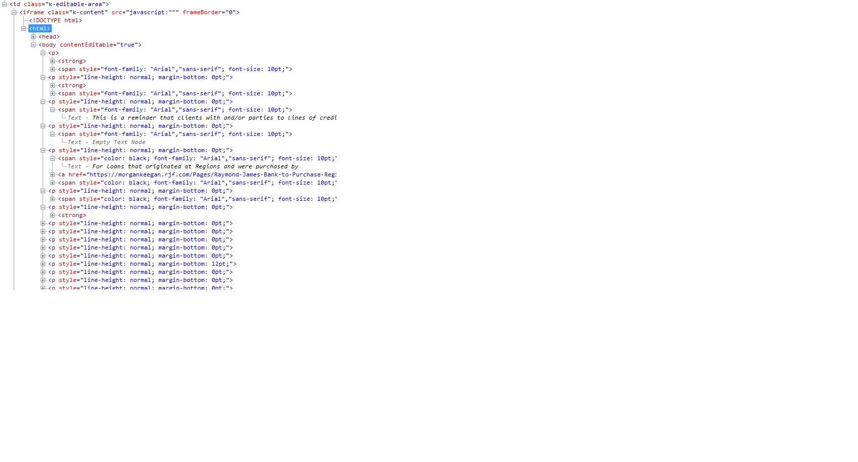 <table class="k-widget k-editor k-header" cellspacing="4" cellpadding="0" role="presentation" style="width: 1002px; height: 402px;"><tbody><tr role="presentation"><tr><td class="k-editable-area"><iframe class="k-content" frameborder="0" src="javascript:"""><!DOCTYPE html><html><head><body contenteditable="true"><p><p style="line-height:normal;margin-bottom:0pt;"><p style="line-height:normal;margin-bottom:0pt;"><span style="font-family:'Arial','sans-serif';font-size:10pt;">This is a reminder that clients with and/or parties to lines of credit at Raymond James Bank and secured by Morgan Keegan brokerage accounts received a mailing regarding the terms of the loans. The mailing was sent from Raymond James Bank at the end of December. </span></p><p style="line-height:normal;margin-bottom:0pt;"><span style="font-family:'Arial','sans-serif';font-size:10pt;"> </span></p><p style="line-height:normal;margin-bottom:0pt;"><p style="line-height:normal;margin-bottom:0pt;"><p style="line-height:normal;margin-bottom:0pt;"><p style="line-height:normal;margin-bottom:0pt;"><strong><span style="color:black;font-family:'Arial','sans-serif';font-size:10pt;"> </span></strong></p><p style="line-height:normal;margin-bottom:0pt;"><p style="line-height:normal;margin-bottom:0pt;"><p style="line-height:normal;margin-bottom:0pt;"><p style="line-height:normal;margin-bottom:0pt;"><p style="line-height:normal;margin-bottom:12pt;"><p style="line-height:normal;margin-bottom:0pt;"><p style="line-height:normal;margin-bottom:0pt;"><p style="line-height:normal;margin-bottom:0pt;"><p style="line-height:normal;margin-bottom:0pt;"><p style="line-height:normal;margin-bottom:0pt;"><p style="line-height:normal;margin-bottom:0pt;"><p style="line-height:normal;margin-bottom:0pt;"><p style="line-height:normal;margin-bottom:0pt;"><table class="RJ_static_table" style="border-collapse:collapse;border-spacing:0;"><p><p style="line-height:normal;margin-bottom:0pt;"><p style="line-height:normal;margin-bottom:0pt;"><p style="line-height:normal;margin-bottom:0pt;"><p style="line-height:normal;margin-bottom:0pt;"><p style="line-height:normal;margin-bottom:0pt;"><table class="RJ_repeating_table" style="border-collapse:collapse;border-spacing:0;"><p><p style="line-height:normal;margin-bottom:0pt;"><p><p style="line-height:normal;margin-bottom:0pt;"></body></html></iframe><textarea id="Body" class="k-content k-raw-content" style="width: 1000px; height: 400px; margin-top: 10px; font-family: Arial,Helvetica,sans-serif; font-size: x-small; display: none;" data-bind="value: Job.Body, contentEditable: JobStatus.IsModifyable" data-tools="[{name:"bold" },{name:"italic"},{name:"underline"},{name:"strikethrough"},{name:"fontName"},{name:"fontSize"},{name:"foreColor"},{name:"backColor"},{name:"customJustifyLeft",exec:customJustifyLeft},{name:"customJustifyCenter",exec:customJustifyCenter},{name:"customJustifyRight",exec:customJustifyRight},{name:"justifyLeft"},{name:"justifyCenter"},{name:"justifyRight"},{name:"customUnorderedList",exec:customUnorderedList},{name:"insertUnorderedList"},{name:"customOrderedList",exec:customOrderedList},{name:"...nt"},{name:"outdent"},{name:"customInsertLink",exec:customInsertLink},{name:"createLink"},{name:"unlink"},{name:"insertImage"},{name:"viewHtml"},{name:"insertToken",tooltip:"Insert Token",exec:insertToken},{name:"insertStaticTable",tooltip:"Insert Static Table",exec:insertStaticTable},{name:"insertRepeatingTable",tooltip:"Insert Repeating Table",exec:insertRepeatingTable},{name:"customTemplate",template:$("#backgroundColor-template").html()},{name:"saveTemplate",tooltip:"Save Template",exec:saveTemplate}]" data-role="customeditor" cols="30" rows="10" name="Body" autocomplete="off"> </textarea>handler=Object { element=kendoJQuery, _events={...}, options={...}, more...}kendoCustomEditor=Object { element=kendoJQuery, _events={...}, options={...}, more...}</td></tr></tbody></table>The paragraph tags are not desired.