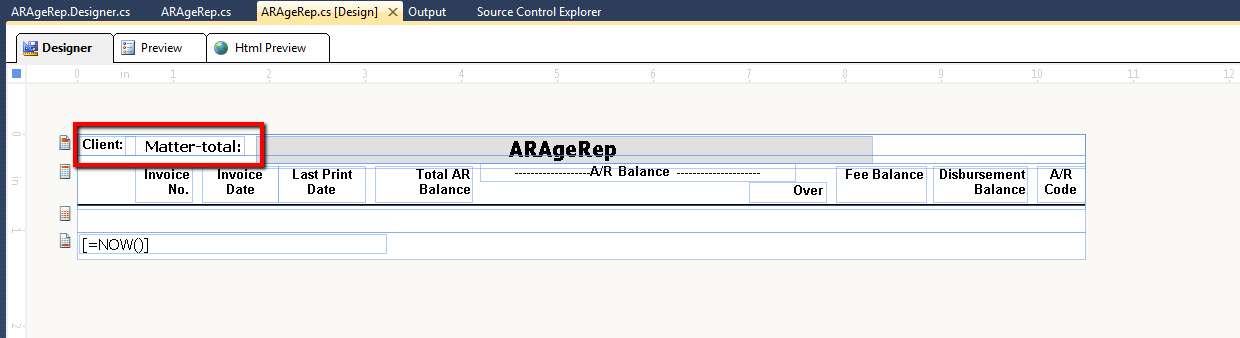 namespace ReportARAgeTest { partial class ARAgeRep { #region Component Designer generated code /// <summary> /// Required method for telerik Reporting designer support - do not modify /// the contents of this method with the code editor. /// </summary> private void InitializeComponent() { Telerik.Reporting.Drawing.StyleRule styleRule1 = new Telerik.Reporting.Drawing.StyleRule(); Telerik.Reporting.Drawing.StyleRule styleRule2 = new Telerik.Reporting.Drawing.StyleRule(); Telerik.Reporting.Drawing.StyleRule styleRule3 = new Telerik.Reporting.Drawing.StyleRule(); Telerik.Reporting.Drawing.StyleRule styleRule4 = new Telerik.Reporting.Drawing.StyleRule(); this.aRMTIDGroupHeader = new Telerik.Reporting.GroupHeaderSection(); this.textBox3 = new Telerik.Reporting.TextBox(); this.aRMTIDGroupFooter = new Telerik.Reporting.GroupFooterSection(); this.aRMTIDGroup = new Telerik.Reporting.Group(); this.pageHeader = new Telerik.Reporting.PageHeaderSection(); this.reportNameTextBox = new Telerik.Reporting.TextBox(); this.pageFooter = new Telerik.Reporting.PageFooterSection(); this.currentTimeTextBox = new Telerik.Reporting.TextBox(); this.detail = new Telerik.Reporting.DetailSection(); this.reportHeaderSection1 = new Telerik.Reporting.ReportHeaderSection(); this.textBox1 = new Telerik.Reporting.TextBox(); this.textBox6 = new Telerik.Reporting.TextBox(); this.textBox7 = new Telerik.Reporting.TextBox(); this.textBox5 = new Telerik.Reporting.TextBox(); this.textBox14 = new Telerik.Reporting.TextBox(); this.txtPeriod4 = new Telerik.Reporting.TextBox(); this.textBox13 = new Telerik.Reporting.TextBox(); this.textBox15 = new Telerik.Reporting.TextBox(); this.textBox17 = new Telerik.Reporting.TextBox(); this.group1 = new Telerik.Reporting.Group(); this.groupFooterSection1 = new Telerik.Reporting.GroupFooterSection(); this.textBox11 = new Telerik.Reporting.TextBox(); this.groupHeaderSection1 = new Telerik.Reporting.GroupHeaderSection(); ((System.ComponentModel.ISupportInitialize)(this)).BeginInit(); // // aRMTIDGroupHeader // this.aRMTIDGroupHeader.Height = new Telerik.Reporting.Drawing.Unit(0.21958820521831513D, Telerik.Reporting.Drawing.UnitType.Inch); this.aRMTIDGroupHeader.Items.AddRange(new Telerik.Reporting.ReportItemBase[] { this.textBox3}); this.aRMTIDGroupHeader.Name = "aRMTIDGroupHeader"; this.aRMTIDGroupHeader.Style.Font.Bold = true; // // textBox3 // this.textBox3.Location = new Telerik.Reporting.Drawing.PointU(new Telerik.Reporting.Drawing.Unit(0.02083333395421505D, Telerik.Reporting.Drawing.UnitType.Inch), new Telerik.Reporting.Drawing.Unit(0.019588232040405273D, Telerik.Reporting.Drawing.UnitType.Inch)); this.textBox3.Name = "textBox3"; this.textBox3.Size = new Telerik.Reporting.Drawing.SizeU(new Telerik.Reporting.Drawing.Unit(0.5791667103767395D, Telerik.Reporting.Drawing.UnitType.Inch), new Telerik.Reporting.Drawing.Unit(0.19999997317790985D, Telerik.Reporting.Drawing.UnitType.Inch)); this.textBox3.Value = "Client: "; // // aRMTIDGroupFooter // this.aRMTIDGroupFooter.Height = new Telerik.Reporting.Drawing.Unit(0.78329390287399292D, Telerik.Reporting.Drawing.UnitType.Inch); this.aRMTIDGroupFooter.Name = "aRMTIDGroupFooter"; this.aRMTIDGroupFooter.Style.Font.Bold = true; // // aRMTIDGroup // this.aRMTIDGroup.GroupFooter = this.aRMTIDGroupFooter; this.aRMTIDGroup.GroupHeader = this.aRMTIDGroupHeader; this.aRMTIDGroup.Groupings.AddRange(new Telerik.Reporting.Data.Grouping[] { new Telerik.Reporting.Data.Grouping("=Fields.ARCLID")}); this.aRMTIDGroup.Name = "aRMTIDGroup"; // // pageHeader // this.pageHeader.Height = new Telerik.Reporting.Drawing.Unit(0.29988190531730652D, Telerik.Reporting.Drawing.UnitType.Inch); this.pageHeader.Items.AddRange(new Telerik.Reporting.ReportItemBase[] { this.reportNameTextBox}); this.pageHeader.Name = "pageHeader"; this.pageHeader.Style.TextAlign = Telerik.Reporting.Drawing.HorizontalAlign.Center; // // reportNameTextBox // this.reportNameTextBox.Location = new Telerik.Reporting.Drawing.PointU(new Telerik.Reporting.Drawing.Unit(1.8601188659667969D, Telerik.Reporting.Drawing.UnitType.Inch), new Telerik.Reporting.Drawing.Unit(0.018671274185180664D, Telerik.Reporting.Drawing.UnitType.Inch)); this.reportNameTextBox.Name = "reportNameTextBox"; this.reportNameTextBox.Size = new Telerik.Reporting.Drawing.SizeU(new Telerik.Reporting.Drawing.Unit(6.4166665077209473D, Telerik.Reporting.Drawing.UnitType.Inch), new Telerik.Reporting.Drawing.Unit(0.28117135167121887D, Telerik.Reporting.Drawing.UnitType.Inch)); this.reportNameTextBox.Style.BackgroundColor = System.Drawing.Color.FromArgb(((int)(((byte)(224)))), ((int)(((byte)(224)))), ((int)(((byte)(224))))); this.reportNameTextBox.Style.Font.Bold = true; this.reportNameTextBox.Style.Font.Size = new Telerik.Reporting.Drawing.Unit(16D, Telerik.Reporting.Drawing.UnitType.Point); this.reportNameTextBox.Style.TextAlign = Telerik.Reporting.Drawing.HorizontalAlign.Center; this.reportNameTextBox.StyleName = "PageInfo"; this.reportNameTextBox.Value = "ARAgeRep"; // // pageFooter // this.pageFooter.Height = new Telerik.Reporting.Drawing.Unit(0.28125D, Telerik.Reporting.Drawing.UnitType.Inch); this.pageFooter.Items.AddRange(new Telerik.Reporting.ReportItemBase[] { this.currentTimeTextBox}); this.pageFooter.Name = "pageFooter"; // // currentTimeTextBox // this.currentTimeTextBox.Location = new Telerik.Reporting.Drawing.PointU(new Telerik.Reporting.Drawing.Unit(0.02083333395421505D, Telerik.Reporting.Drawing.UnitType.Inch), new Telerik.Reporting.Drawing.Unit(0.02083333395421505D, Telerik.Reporting.Drawing.UnitType.Inch)); this.currentTimeTextBox.Name = "currentTimeTextBox"; this.currentTimeTextBox.Size = new Telerik.Reporting.Drawing.SizeU(new Telerik.Reporting.Drawing.Unit(3.1979167461395264D, Telerik.Reporting.Drawing.UnitType.Inch), new Telerik.Reporting.Drawing.Unit(0.20000000298023224D, Telerik.Reporting.Drawing.UnitType.Inch)); this.currentTimeTextBox.StyleName = "PageInfo"; this.currentTimeTextBox.Value = "=NOW()"; // // detail // this.detail