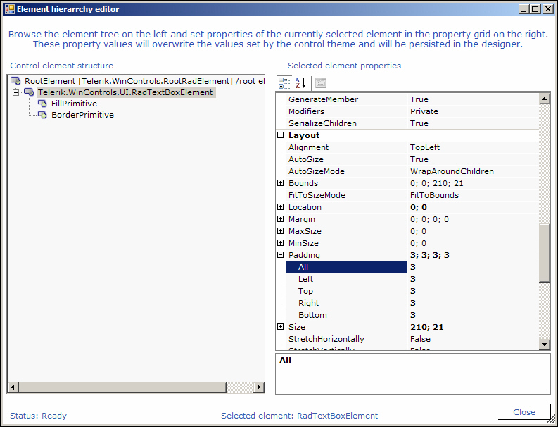 Multiline = false Only the width of the TextBox can be changed in this case (the standard TextBox cannot be sized vertically either in that case). To change the width just drag the right or left border of the control. Here, the height of the text box is determined by the font size. If RadTextBox seems too thin you can set some Padding for the text element. To do so open the ActionList for the text box and click on "Edit UI elements". Then select RadTextBoxElement and set its property Padding (see attached screenshot).
