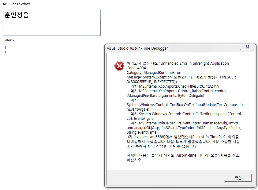 There is no problem to write in MS RichTextBox,however,tererik one throws error as soon as start typing, as shown attached image