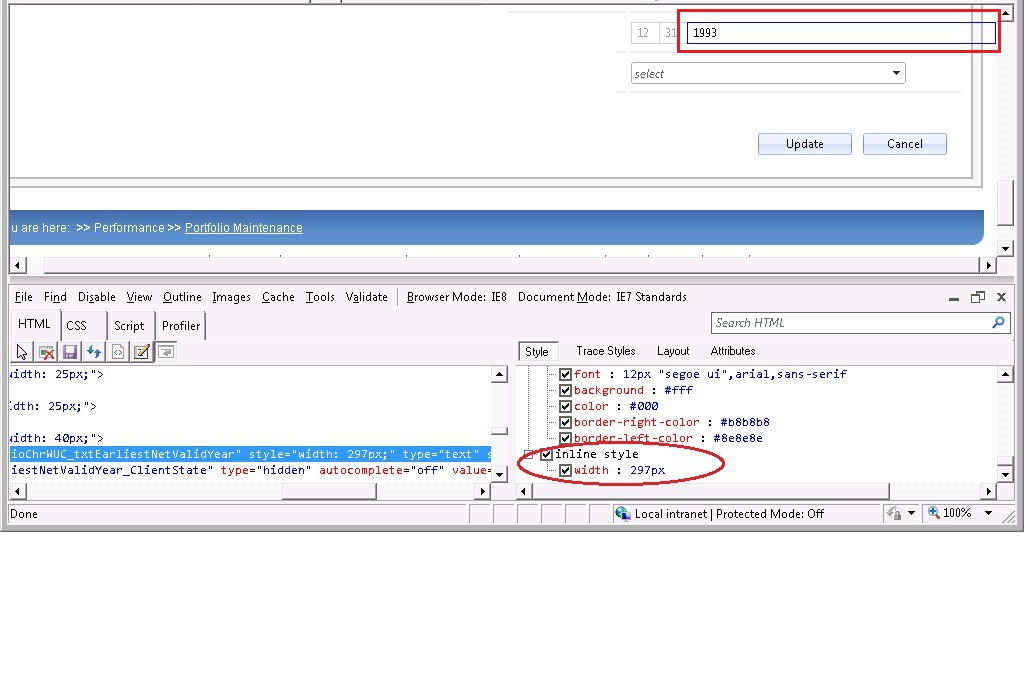 We have upgraded telerik version 2012.2.912.40 recently. After upgrade, the textboxes width is not getting displayed correct as specified in aspx when page loads first time in IE. If we refresh the page, it is loading with specified size. The developer tool shows the text box width (Inline style) as "297px" which is no where mentioned in our application. Attached the screenshot for reference. This issue happening after upgrade. The same issue with RadDatePicker DateInput text box also.