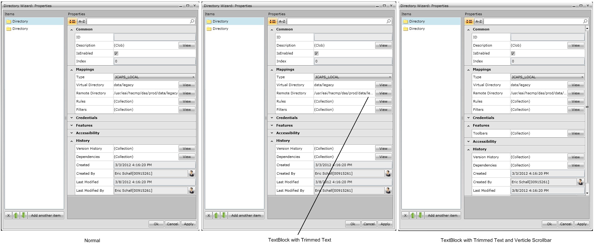 <telerik:PropertyDefinition DisplayName="Remote Directory" Description="The base remote path of the directory." GroupName="Mappings" OrderIndex="6"> <telerik:PropertyDefinition.EditorTemplate> <DataTemplate> <Grid> <Grid> <Grid.ColumnDefinitions> <ColumnDefinition Width="*"/> <ColumnDefinition Width="Auto"/> </Grid.ColumnDefinitions> <TextBlock Text="{Binding BaseRemoteDirectory, Mode=OneWay}" TextTrimming="WordEllipsis" VerticalAlignment="Center"> <ToolTipService.ToolTip> <TextBlock Text="{Binding BaseRemoteDirectory, Mode=OneWay}" TextTrimming="WordEllipsis" TextWrapping="Wrap" MaxHeight="85" MaxWidth="275"/> </ToolTipService.ToolTip> </TextBlock> <telerik:RadButton Content="View" Grid.Column="1" Width="55" Click="OnViewRemoteVirtualDirectory_Click" Margin="1"/> </Grid> </Grid> </DataTemplate> </telerik:PropertyDefinition.EditorTemplate> </telerik:PropertyDefinition>