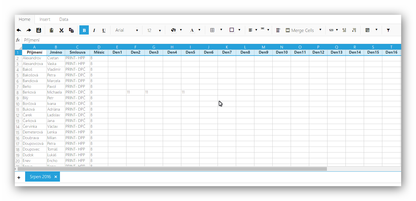 public override List<Worksheet> GetSheets() { var result = new List<Worksheet>(); DataTable data = GetData(); var sheet = new Worksheet(); sheet.Name = "Srpen 2016"; int rowIndex = 1; foreach (DataRow dataRow in data.Rows) { var row = new Row() { Index = rowIndex++ }; int columnIndex = 0; foreach(DataColumn dataColumn in data.Columns) { if (dataColumn.ColumnName == "DochazkaID") continue; string cellValue = dataRow[dataColumn.ColumnName].ToString(); var cell = new Cell() { Index = columnIndex++, Value = cellValue }; row.AddCell(cell); } sheet.AddRow(row); } result.Add(sheet); return result; } public DataTable GetData() { using (SqlConnection conn = new SqlConnection(System.Configuration.ConfigurationManager.ConnectionStrings["DefaultConnection"].ConnectionString)) { conn.Open(); string query = "SELECT Dochazka.DochazkaID,Zamestnanci.Prijmeni,Zamestnanci.Jmeno,Zakazky.Zkratka,Dochazka.MesicID,Dochazka.Den1,Dochazka.Den2,Dochazka.Den3,Dochazka.Den4,Dochazka.Den5,Dochazka.Den6,Dochazka.Den7,Dochazka.Den8,Dochazka.Den9,Dochazka.Den10,Dochazka.Den11,Dochazka.Den12,Dochazka.Den13,Dochazka.Den14,Dochazka.Den15,Dochazka.Den16,Dochazka.Den17,Dochazka.Den18,Dochazka.Den19,Dochazka.Den20,Dochazka.Den21,Dochazka.Den22,Dochazka.Den23,Dochazka.Den24,Dochazka.Den25,Dochazka.Den26,Dochazka.Den27,Dochazka.Den28,Dochazka.Den29,Dochazka.Den30,Dochazka.Den31 FROM dbo.Dochazka INNER JOIN dbo.Zamestnanci ON Dochazka.ZamestnanecID = Zamestnanci.ZamestnanecID INNER JOIN dbo.Zakazky ON Dochazka.ZakazkaID = Zakazky.ZakazkaID WHERE Dochazka.MesicID = DATEPART(MONTH, GETDATE()) ORDER BY Zamestnanci.Prijmeni"; SqlCommand cmd = new SqlCommand(query, conn); DataTable dt = new DataTable(); dt.Load(cmd.ExecuteReader()); return dt; } }