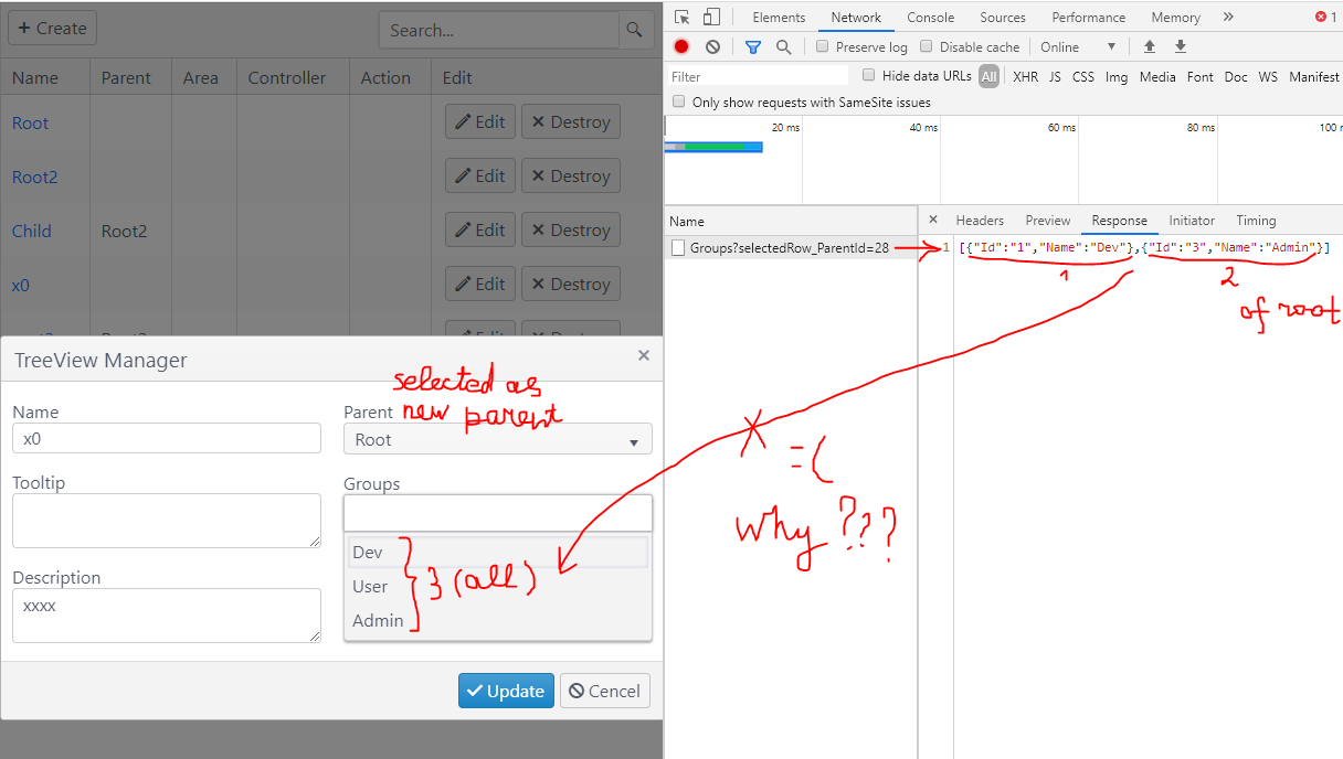 01.public JsonResult Groups(string selectedRow_ParentId)02.{03. using (TreeViewEntities context = new TreeViewEntities())04. {05. if (string.IsNullOrEmpty(selectedRow_ParentId))06. {07. var allGroups = context.Group08. .AsEnumerable()09. .Select(x => new10. {11. Id = x.Id.ToString(),12. Name = x.Name13. })14. .ToList();15. 16. return Json(allGroups, JsonRequestBehavior.AllowGet);17. }18. 19. var nodeGroups = context.Node20. .AsEnumerable()21. .First(x => x.Id == long.Parse(selectedRow_ParentId)).Group22. .Select(x => new23. {24. Id = x.Id.ToString(),25. Name = x.Name26. })27. .ToList();28. 29. return Json(nodeGroups, JsonRequestBehavior.AllowGet);30. }31.}