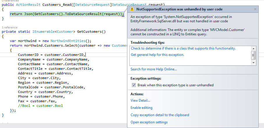 From the provided information it seems that you are trying to project the entities returned by the "northwind.Customers" to existing entity type which is not supported. In current case I would suggest to create "CustomersViewModel" class and update the "GetCustomers" method as follows: