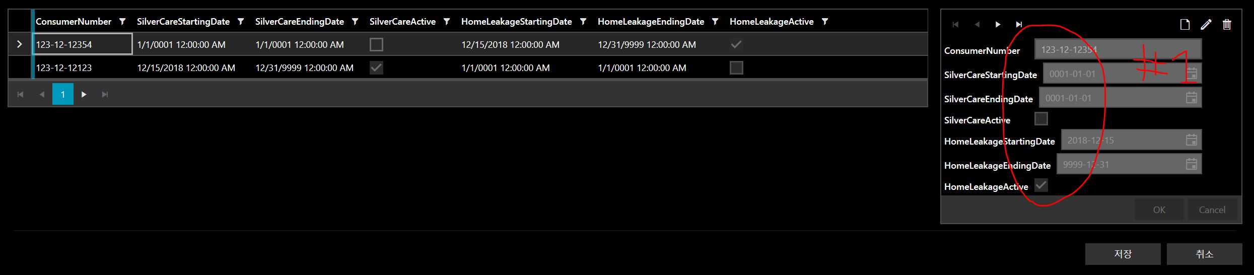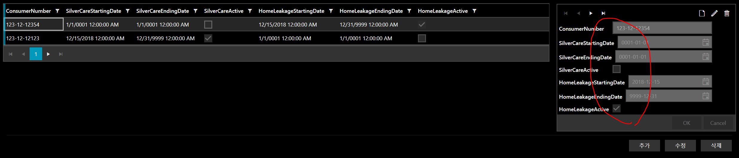 public class EtcServiceRegistrationModel : ObservableObject, IEditableObject{ EtcServiceRegistrationData backupEtcServiceRegistrationData; private string consumerNumber; private DateTime silverCareStartingDate; private DateTime silverCareEndingDate; private bool silverCareActive; private DateTime homeLeakageStartingDate; private DateTime homeLeakageEndingDate; private bool homeLeakageActive; public EtcServiceRegistrationModel() { } public EtcServiceRegistrationModel(string _consumerNumber, DateTime _silverCareStartingDate, DateTime _silverCareEndingDate, bool _silverCareActive, DateTime _homeLeakageStartingDate, DateTime _homeLeakageEndingDate, bool _homeLeakageActive) { this.backupEtcServiceRegistrationData = new EtcServiceRegistrationData(); this.backupEtcServiceRegistrationData.consumerNumber = _consumerNumber; this.consumerNumber = _consumerNumber; this.backupEtcServiceRegistrationData.silverCareStartingDate = _silverCareStartingDate; this.silverCareStartingDate = _silverCareStartingDate; this.backupEtcServiceRegistrationData.silverCareEndingDate = _silverCareEndingDate; this.silverCareEndingDate = _silverCareEndingDate; this.backupEtcServiceRegistrationData.silverCareActive = _silverCareActive; this.silverCareActive = _silverCareActive; this.backupEtcServiceRegistrationData.homeLeakageStartingDate = _homeLeakageStartingDate; this.homeLeakageStartingDate = _homeLeakageStartingDate; this.backupEtcServiceRegistrationData.homeLeakageEndingDate = _homeLeakageEndingDate; this.homeLeakageEndingDate = _homeLeakageEndingDate; this.backupEtcServiceRegistrationData.homeLeakageActive = _homeLeakageActive; this.homeLeakageActive = _homeLeakageActive; } public struct EtcServiceRegistrationData { internal string consumerNumber; internal DateTime silverCareStartingDate; internal DateTime silverCareEndingDate; internal bool silverCareActive; internal DateTime homeLeakageStartingDate; internal DateTime homeLeakageEndingDate; internal bool homeLeakageActive; } public string ConsumerNumber { get { return consumerNumber; } set { consumerNumber = value; RaisePropertyChanged(() => this.ConsumerNumber); } } public DateTime SilverCareStartingDate { get { return silverCareStartingDate; } set { silverCareStartingDate = value; RaisePropertyChanged(() => this.SilverCareStartingDate); } } public DateTime SilverCareEndingDate { get { return silverCareEndingDate; } set { silverCareEndingDate = value; RaisePropertyChanged(() => this.SilverCareEndingDate); } } public bool SilverCareActive { get { return silverCareActive; } set { silverCareActive = value; RaisePropertyChanged(() => this.SilverCareActive); } } public DateTime HomeLeakageStartingDate { get { return homeLeakageStartingDate; } set { homeLeakageStartingDate = value; RaisePropertyChanged(() => this.HomeLeakageStartingDate); } } public DateTime HomeLeakageEndingDate { get { return homeLeakageEndingDate; } set { homeLeakageEndingDate = value; RaisePropertyChanged(() => this.HomeLeakageEndingDate); } } public bool HomeLeakageActive { get { return homeLeakageActive; } set { homeLeakageActive = value; RaisePropertyChanged(() => this.HomeLeakageActive); } } public void BeginEdit() { } public void CancelEdit() { ConsumerNumber = this.backupEtcServiceRegistrationData.consumerNumber; } public void EndEdit() { this.backupEtcServiceRegistrationData.consumerNumber = ConsumerNumber; }}